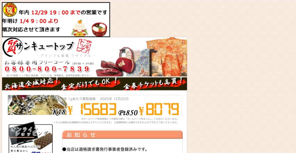 北海道で長年地域に根ざして事業を展開する「サンキュートップ」は、単なる質屋・リサイクルショップに留まらず、暮らしの「困った」を幅広くサポートする便利屋的なサービスも提供しています。ブランド品や家電、金券類などの高価買取を行うだけでなく、ご自宅の片付けや 生前整理・遺品整理 に対応し、不要品の処分や整理整頓の負担を軽減します。