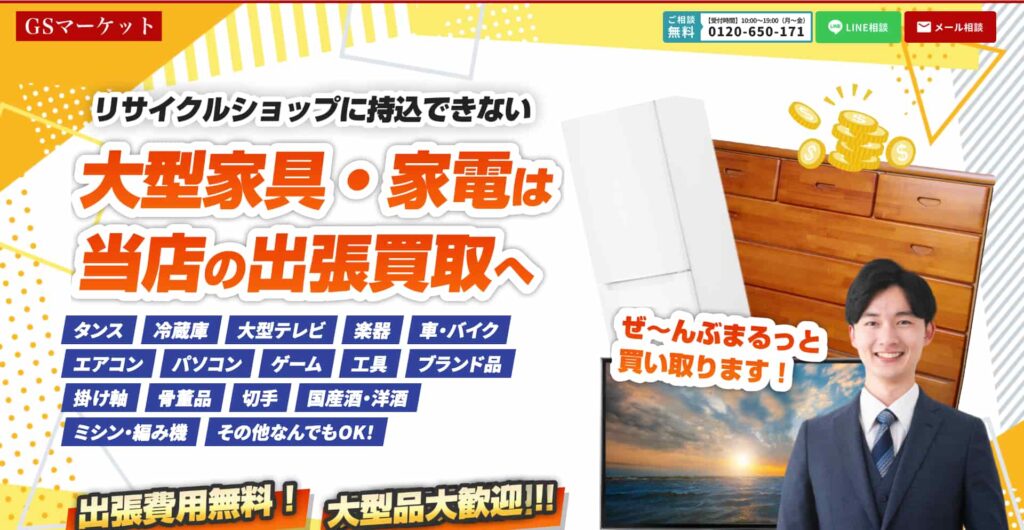 「GSマーケット」は、北海道を拠点に出張買取・不用品回収・遺品整理を展開する地域密着の便利屋サービスです。ご自宅やオフィスの不要品整理や大型家具・家電の処分を手軽に依頼できる強い味方として多くの実績を積んでいます。釣り冷蔵庫やソファー、大型テレビなど、通常のリサイクルショップに持ち込めないサイズの品も現地へ出張して査定・回収が可能で、出張費用は無料です。