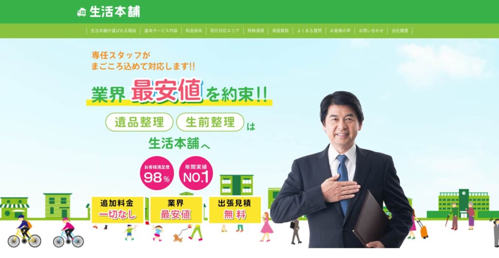 サービス内容 | 遺品整理、生前整理、不用品回収、ゴミ屋敷片付け、不用品買取、特殊清掃、ハウスクリーニングなど |