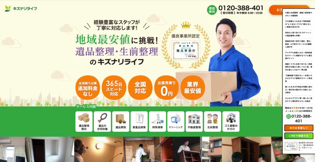 | おすすめポイント | 遺品整理士在籍、年中無休、高価買取によるコスト削減可能、遺品整理士協会認定の「優良事業所」、ワンストップ対応可能 |