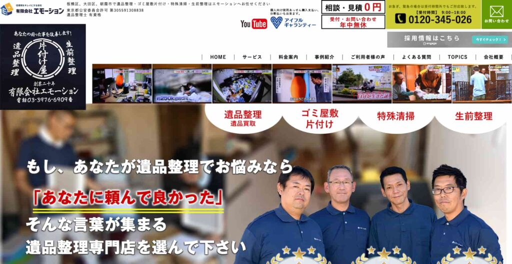 「エモーション」は、東京都板橋区を拠点に、遺品整理を中心としたサービスを展開する企業です。遺品整理士の有資格者が在籍するプロ集団として、ご依頼者様の心情に寄り添いながら真摯に業務に取り組んでいます。故人の思い出が詰まった品々を、ただ処分するだけではなく、貴重品・形見品の捜索、リサイクル・買取、供養対応も含めて丁寧に仕分けを行います。