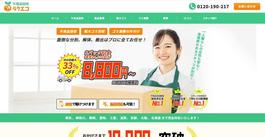 | おすすめポイント | 即日対応、最短30分到着、土日祝対応、業界最安値、損害賠償保険加入済み、買取によるコスト削減可能、完全自社スタッフによる一貫したサービス |