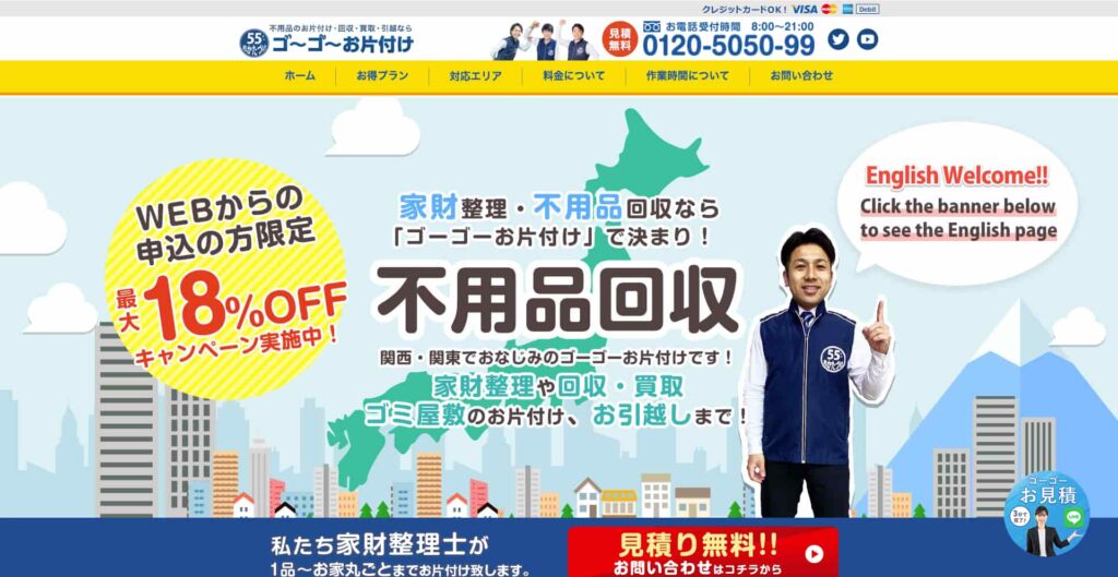 サービス内容遺品整理、不用品回収、粗大ゴミ処分、不用品買取、ハウスクリーニングなど