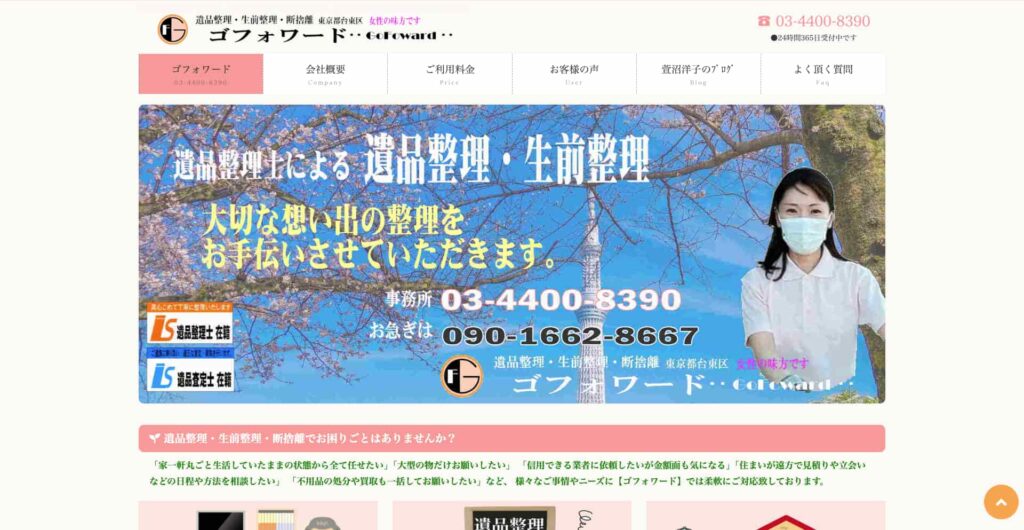 サービス内容遺品整理、生前整理、不用品回収、ゴミ屋敷清掃、特殊清掃など