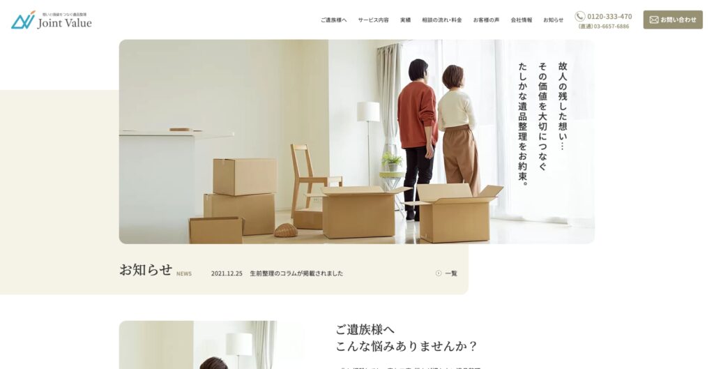 「ジョイントバリュー」は、「想いと価値をつなぐ」遺品整理サービスを提供する企業です。生前整理・遺品整理・家財整理を通じて、故人の遺された「想い」と「モノの価値」を丁寧に受け継ぎ、ご遺族に寄り添いながら心の整理をお手伝いします。遺品整理は、単なる残置物の処分ではなく、まず品物を一つひとつ心を込めて選別し、専門知識を持つスタッフが査定。買取可能なものは積極的に買い取り、整理費用の軽減に努めます。