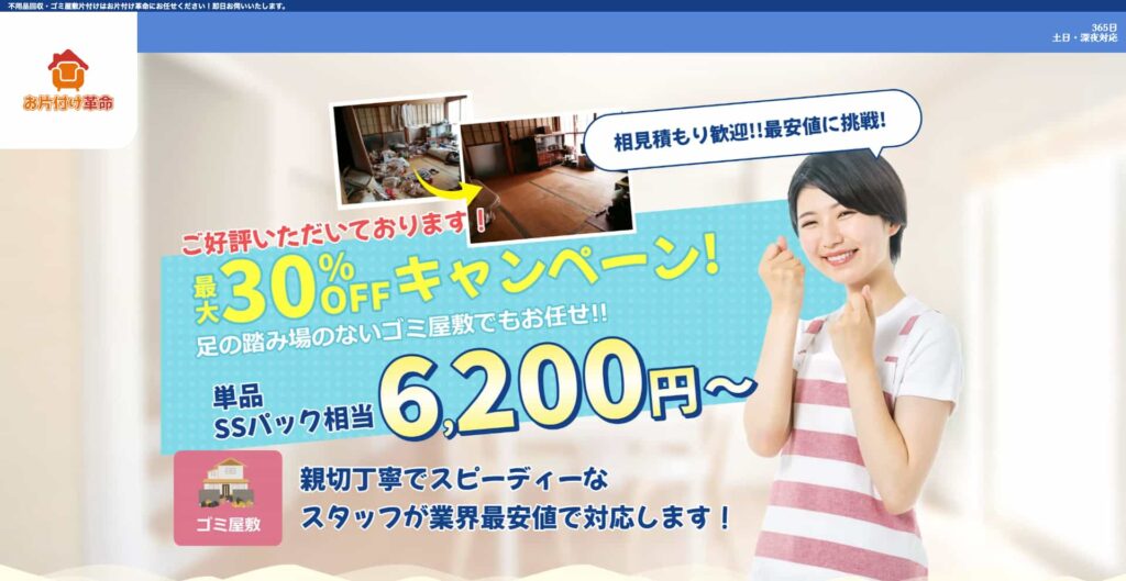 おすすめポイント業界最安値、即日対応、24時間対応、年中無休、土日祝対応、遺品整理士在籍、ワンストップ対応可能
