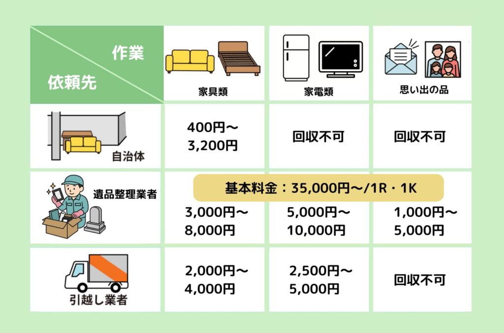 遺品整理の費用は、依頼先や品目、作業規模によって大きく異なります。主な依頼先である自治体サービス、遺品整理業者、引越し業者の不用品処分サービスの費用相場を比較してみましょう。