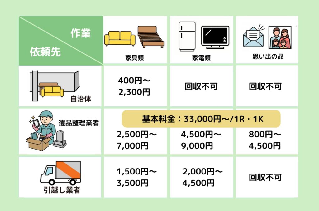 遺品整理の費用は、依頼先や品目、作業規模によって大きく異なります。主な依頼先である自治体サービス、遺品整理業者、引越し業者の不用品処分サービスの費用相場を比較してみましょう。