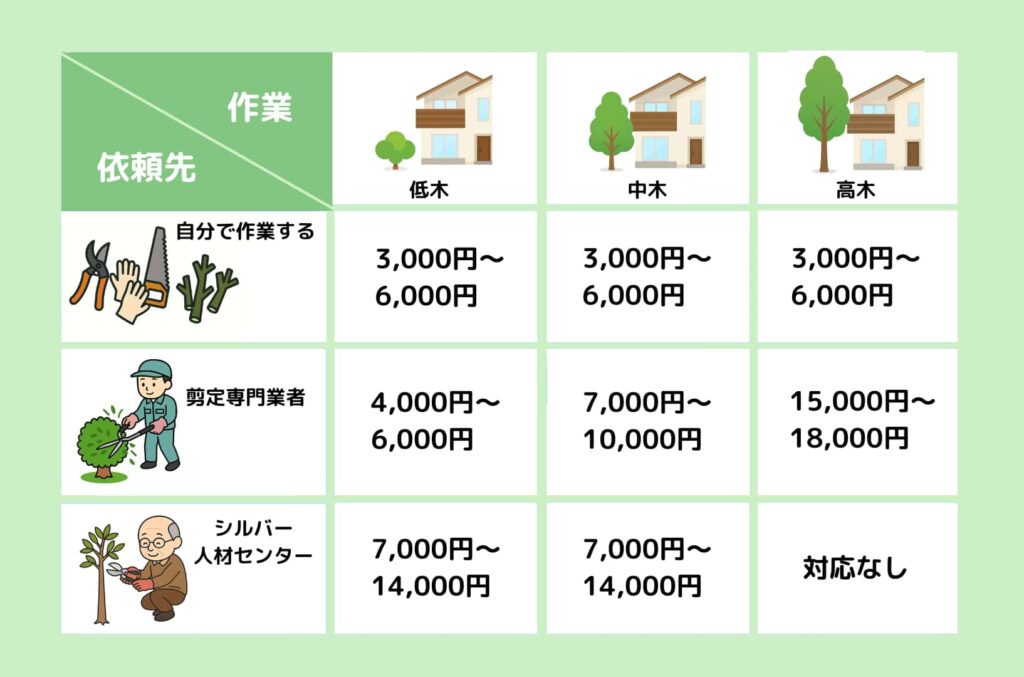 シルバー人材センターを利用する場合は、地域の高齢者スタッフが剪定作業を手作業や簡易な道具で行ってくれます。料金は半日〜1日単位の人件費制で、小規模な作業ではプロの造園業者より安く済むこともありますが、作業量が多い場合や高木の剪定などではかえって割高になることもあります。対応できる作業範囲や日程に制限がある場合もあります。剪定の料金は、木の本数・高さ・作業内容によって異なりますが、低木は 7,000円〜14,000円程度、中木は7,000円〜14,000円程度、高木は対応不可の場合が多いです。高所作業や太枝の剪定、複雑な整形など専門性の高い作業には対応していないことが多いです。
