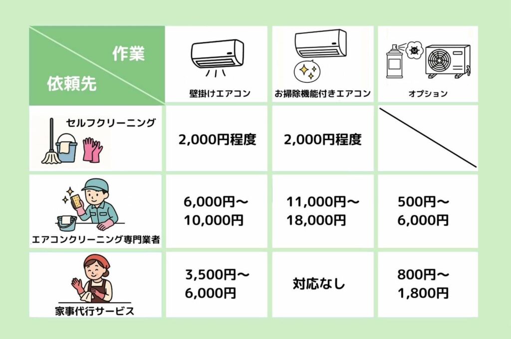 | 費用感 | 壁掛けエアコン:10,000円 お掃除機能付きエアコン:18,000円 |