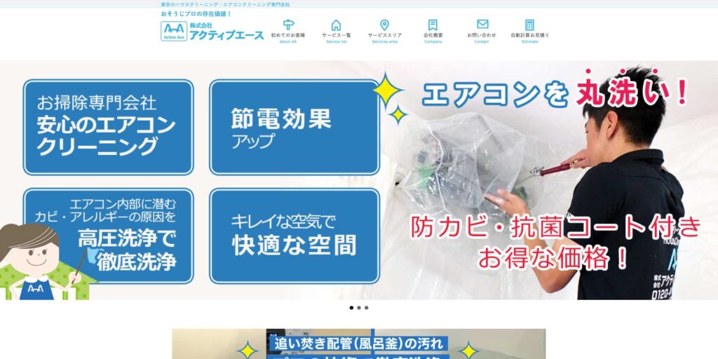 株式会社アクティブエースは、ハウスクリーニング専門会社で、特にエアコンクリーニングにおいて高い評価を得ていおり、年間2,000件以上の実績を誇り、累計30,000件以上の施工経験があります。エアコンクリーニングは、壁掛け型から天井埋込型、床置き型、フィルター自動お掃除機能付きタイプまで幅広く対応。自社スタッフが専門技術と接客マナーを習得し、丁寧な養生と徹底洗浄を行います。