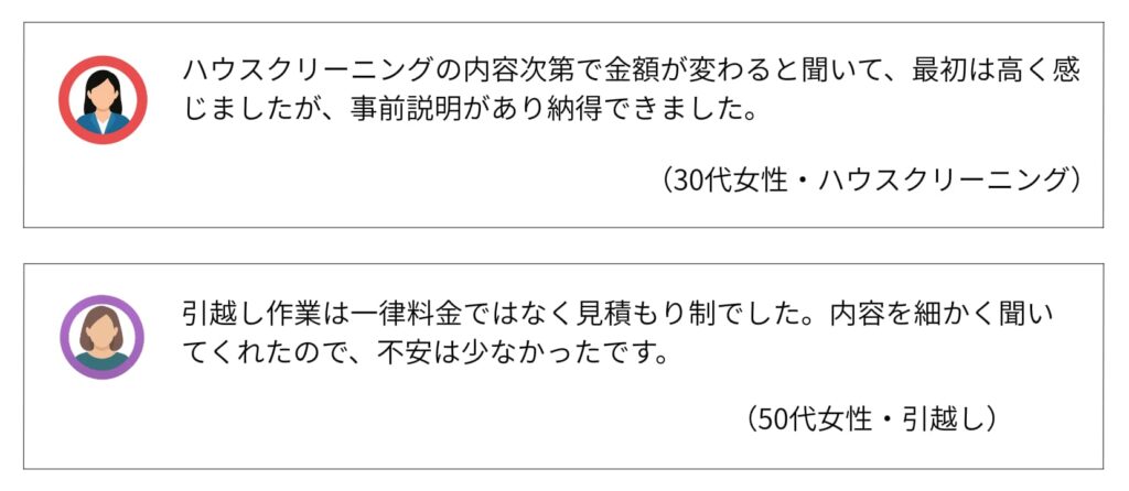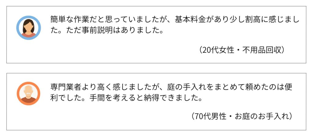 一方で口コミを見ると、「内容を理解したうえで頼めば納得できた」という意見も多く、作業内容と料金のバランスをどう捉えるかで評価が分かれやすいポイントと言えるでしょう。事前の見積もりや説明をどう受け取るかで、満足度が左右されやすいポイントです。