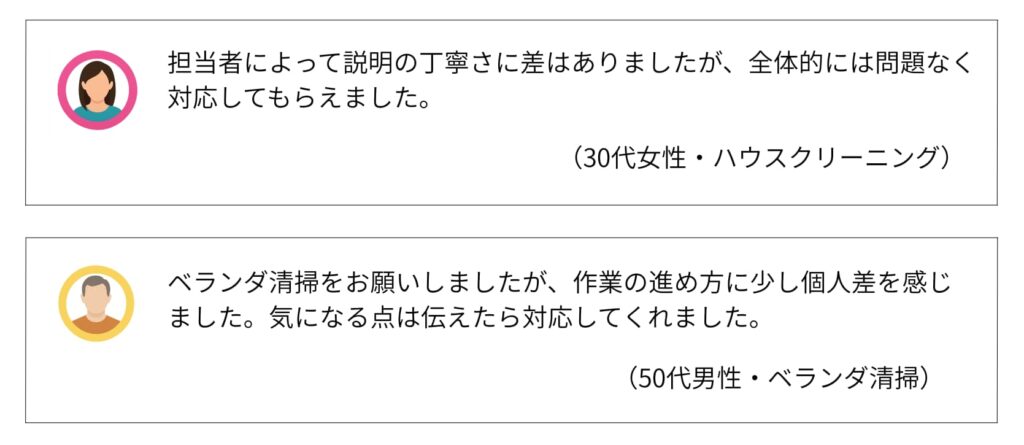 ただし、「極端に対応が悪かった」といった声は多くなく、気になる点があれば相談しやすいという意見も目立ちます。便利屋サービスは人が対応する以上、相性の影響を受けやすい面もあります。最初から完璧を求めすぎず、要望をきちんと伝えながら利用することで、満足度を高めやすいでしょう。事前に希望を伝えておくことで、感じ方はかなり変わってきそうです。