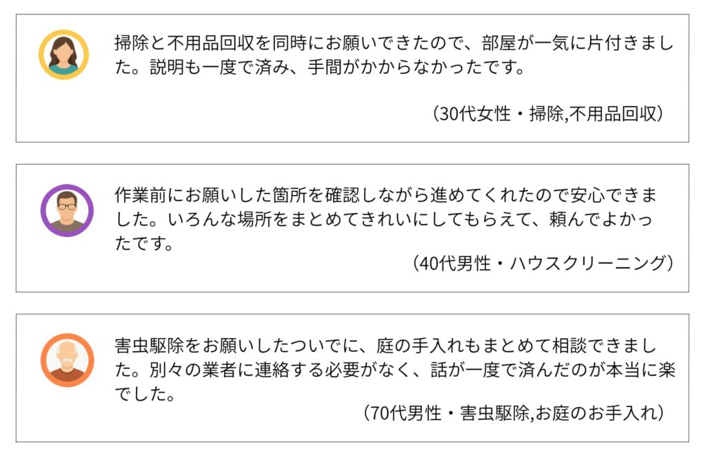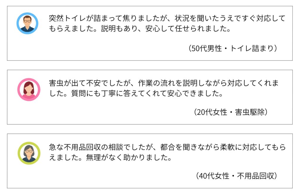 ベンリーの良い評判には、「まとめて頼めて助かった」「対応が丁寧で安心できた」といった声が多く見られます。ここでは、実際の口コミから評価されているポイントを確認していきましょう。