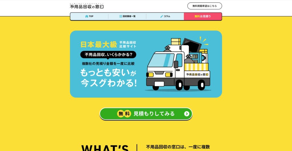 不用品回収の窓口は、複数の回収業者を比較・紹介してくれるサービスで、業者探しの手間を省きつつ、見積もりや対応を比べて選べる点が特徴です。初めてで不安な人や、失敗を避けたい人に向いています。