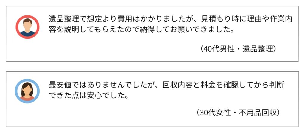 一方で、「業者によって料金や対応に差があった」「想定より高く感じた」という口コミも見られ、すべての人にとって最適とは限りません。最安値を重視する人よりも、「手間をかけずに安心して依頼したい人」ほど満足しやすい傾向があります。