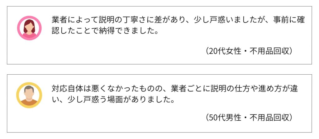 ただし、「事前に細かく伝えておけば問題なかった」「写真を送ったことでズレが減った」といった意見もあり、満足度は情報共有の丁寧さに左右されやすい傾向があります。見積もり時に状況を具体的に伝えることで、トラブルは防ぎやすくなるでしょう。