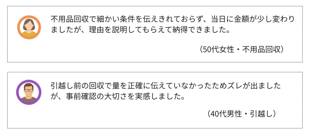 ただし、「想定より回収量が多かった」「含まれると思っていた作業が別料金だった」といった声は見られます。これは後出し請求というより、見積もり時の認識のズレによる不満と言えるでしょう。
