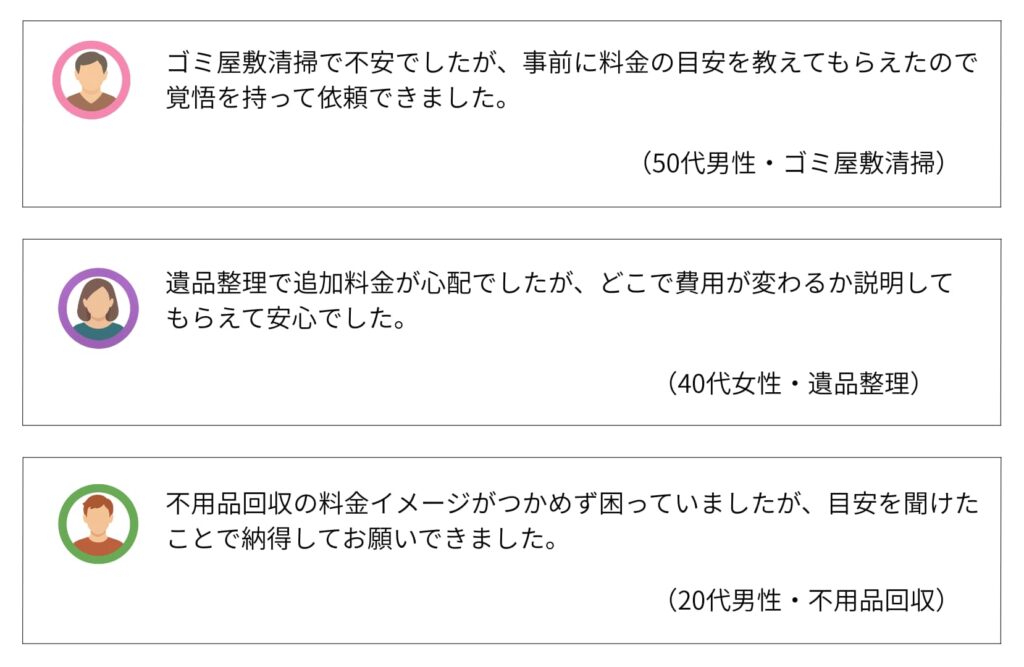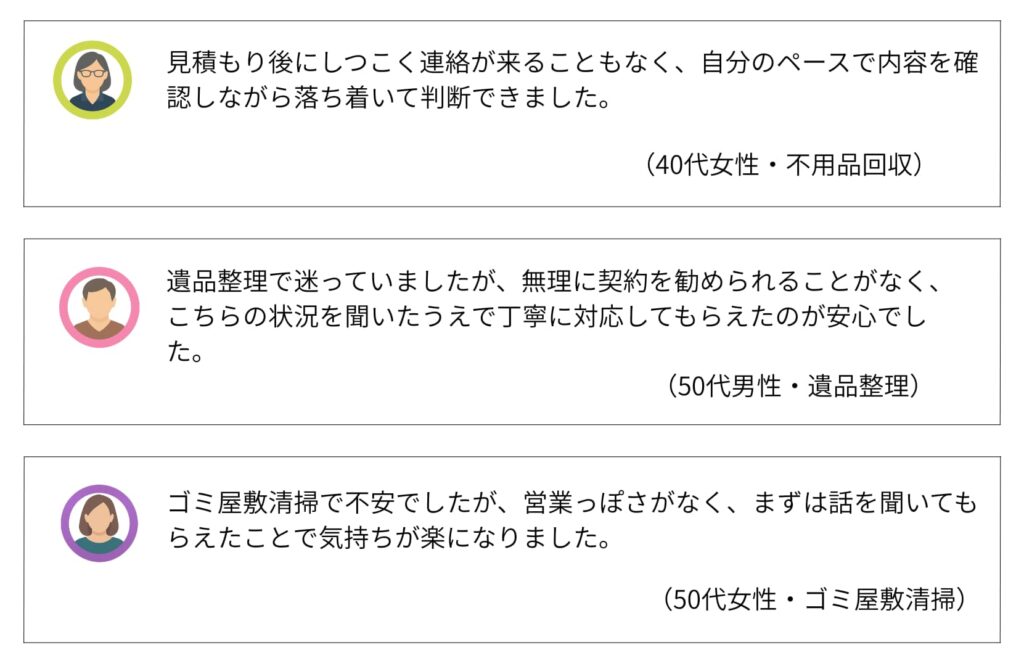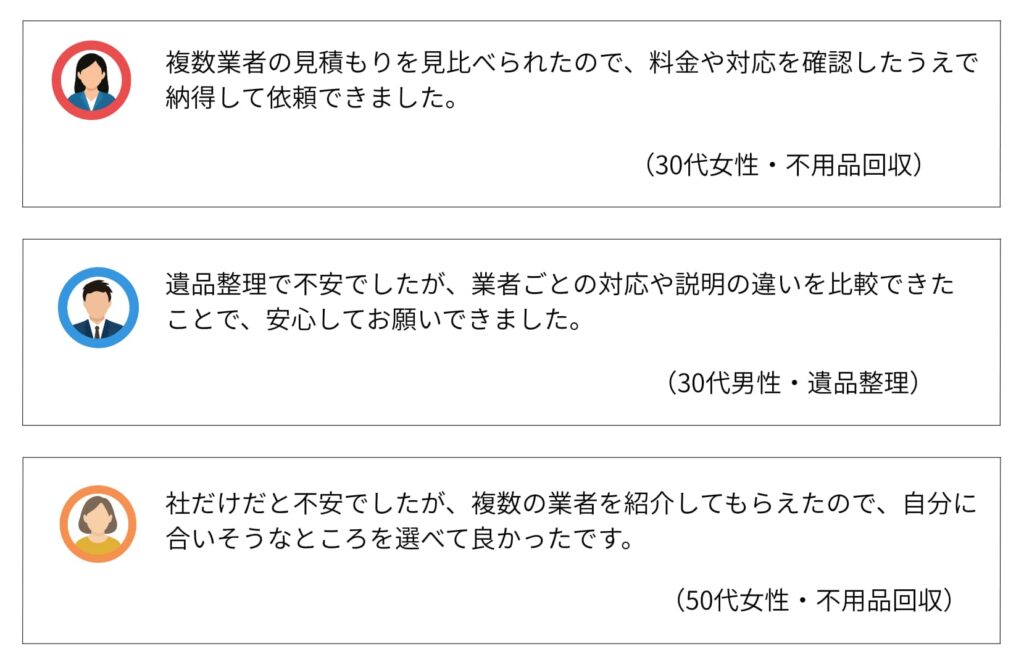 また、最初から1社に決める必要がなく、見積もり内容や対応を比較したうえで選べるため、「知らない業者にいきなり依頼する不安が減った」と感じる人も多いようです。特に、不用品回収や遺品整理など失敗したくない依頼ほど、この比較できる仕組みが安心感につながっています。