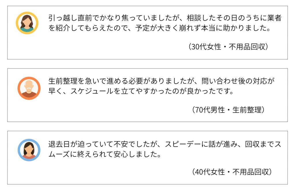 不用品回収の窓口の良い評判として多いのが、「問い合わせから対応までが早かった」という声です。引っ越し前や退去期限が迫っている場合など、急ぎで不用品を処分したい場面でも、状況を伝えることでスピーディーに業者を紹介してもらえる点が評価されています。急な予定変更にも対応しやすい点が安心感につながっています。