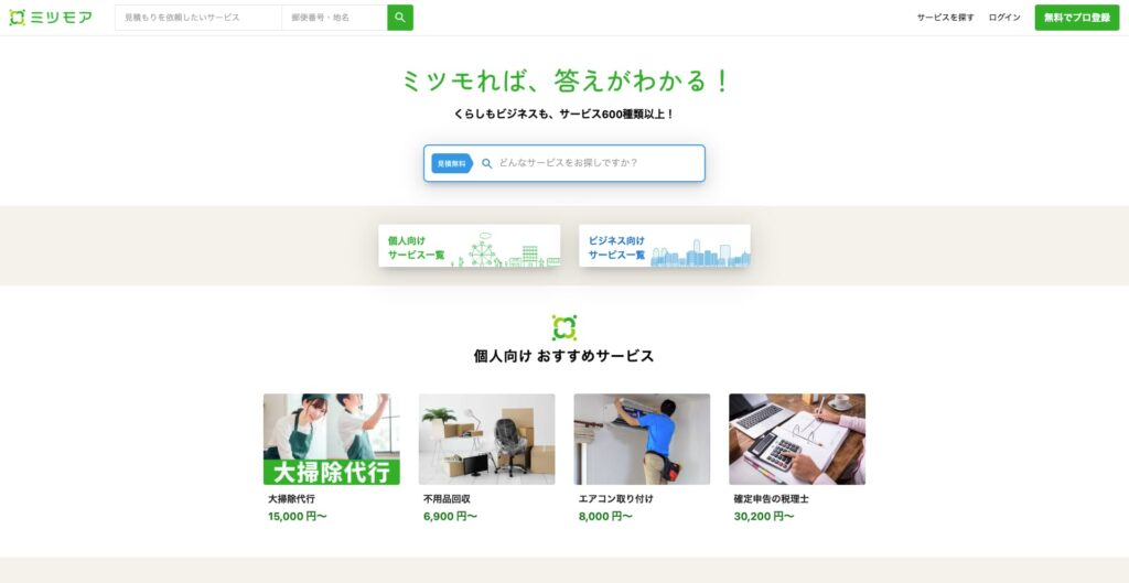 ミツモアは、法人・個人事業主の業者から見積もりを受けて比較する業者マッチング型サービスです。掃除や不用品回収、引越し、害虫駆除、水回りトラブルなど幅広く対応しており、専門的な作業を任せたい人に向いています。条件を確認しながら選べるため、失敗しにくいのが特徴です。