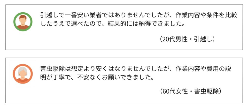 一方で、「業者によって対応や質に差がある」「連絡が遅い業者がいた」といった口コミも見られ、万能なサービスではありません。業者選びを任せきりにしたい人には向きにくい反面、自分で比較・検討できる人ほど満足度が高い傾向があります。