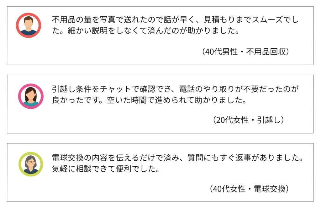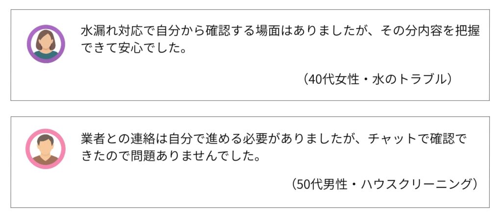 文章で残る分、作業内容や料金の認識ズレが起きにくい点も安心材料です。困りごとをうまく説明できない場合でも、写真を送ったり補足したりしながら相談できるため、初めてでも進めやすいと感じる人が多いようです。忙しい中でも効率よく業者と調整したい人にとって、使い勝手の良さが評価されています。