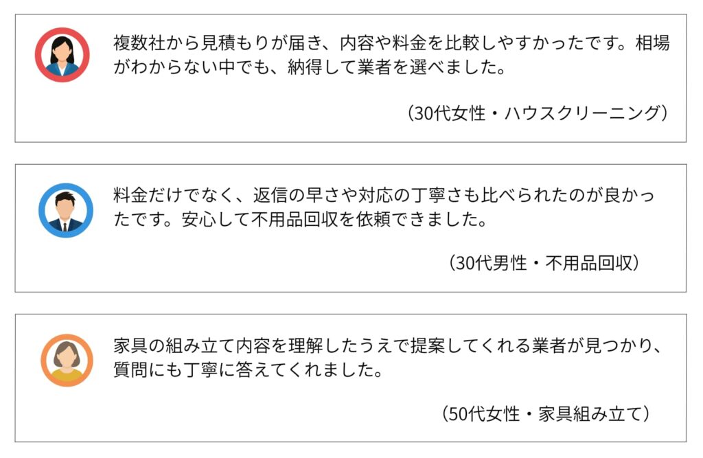 ミツモアの良い評判で特に多いのが、「複数業者を一度に比較できて選びやすかった」という声です。依頼内容を入力するだけで、条件に合う業者から見積もりや提案が届くため、相場感を把握しながら検討できます。個別に業者を探して連絡する手間がなく、「どこに頼めばいいかわからない」という不安を減らせる点が評価されています。