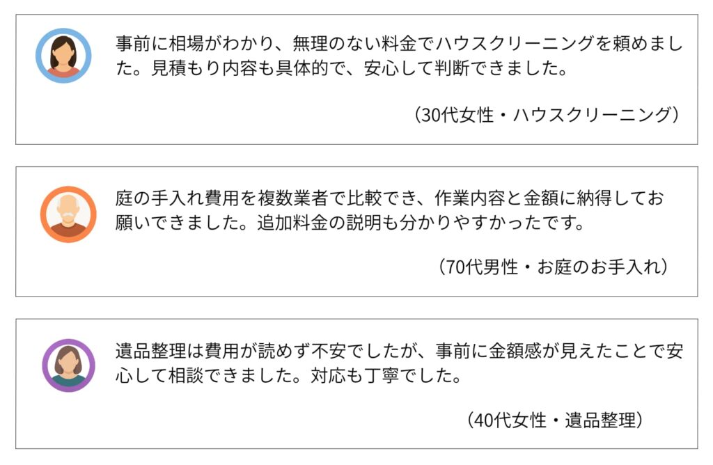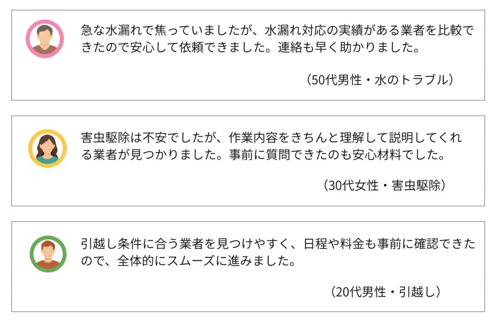 共働き世帯や忙しい人など、効率よく業者探しを進めたい人にも向いています。安さだけで即決するよりも、内容や対応を見比べて納得して依頼したい人ほど、満足度は高くなりやすいでしょう。業者選びを丸投げするのではなく、ある程度自分で判断できる人に適したサービスです。